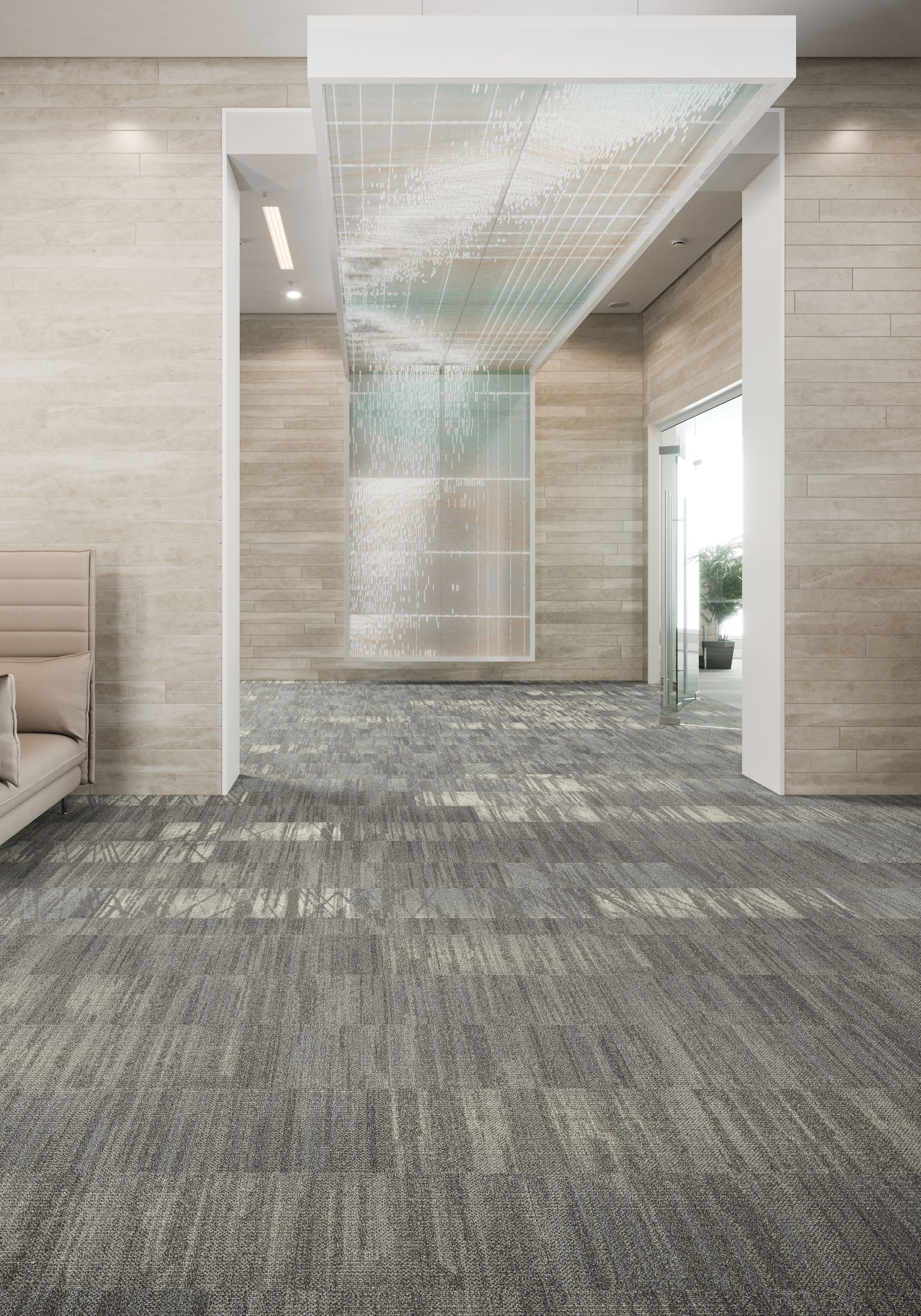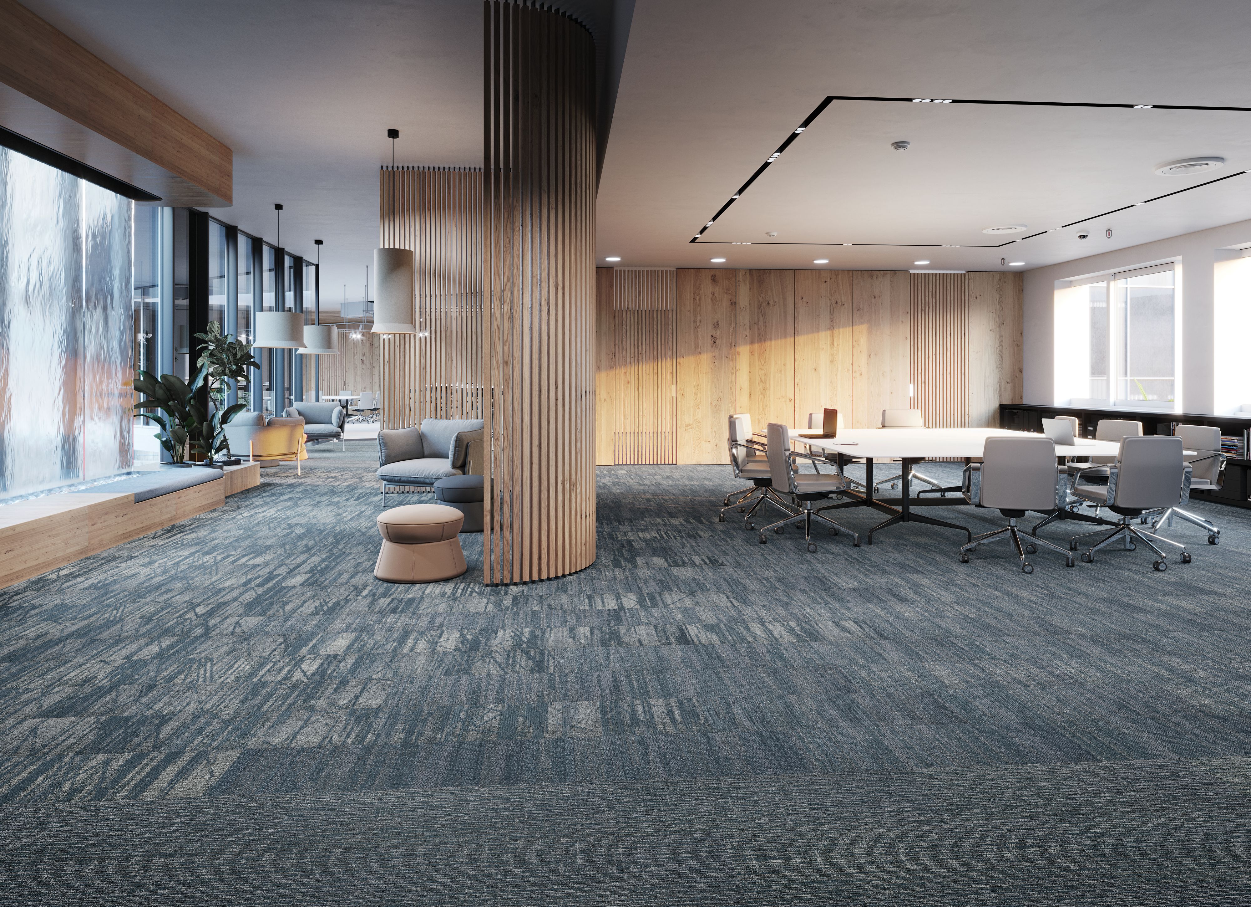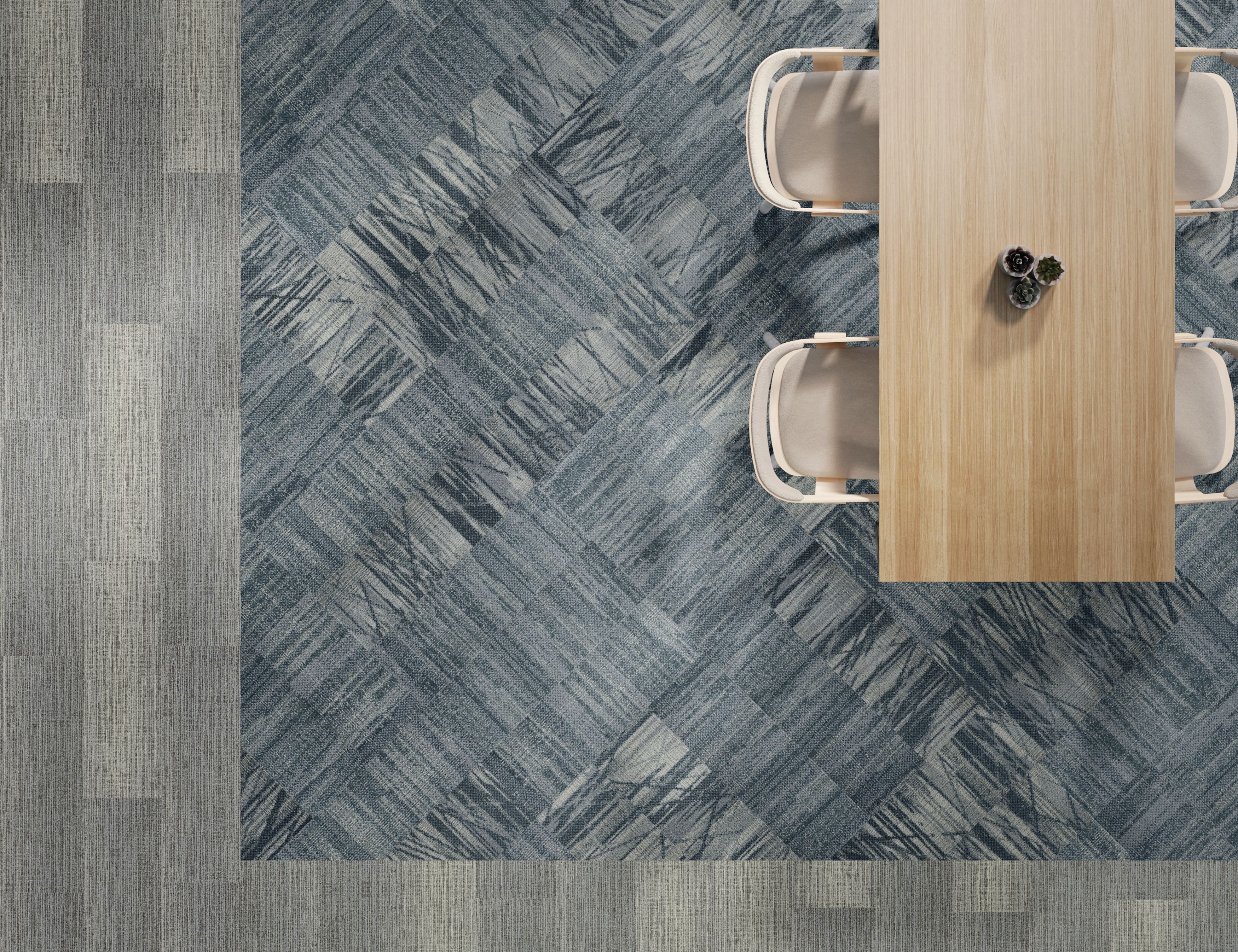 A selection of 8 colorways references the confluence of estuaries, with gradations of colorways from light to dark that mimic transitioning waters. Three carpet tile styles feature a combination of solid, heathered and twisted yarns for dimensional textures that celebrate the movement of water.