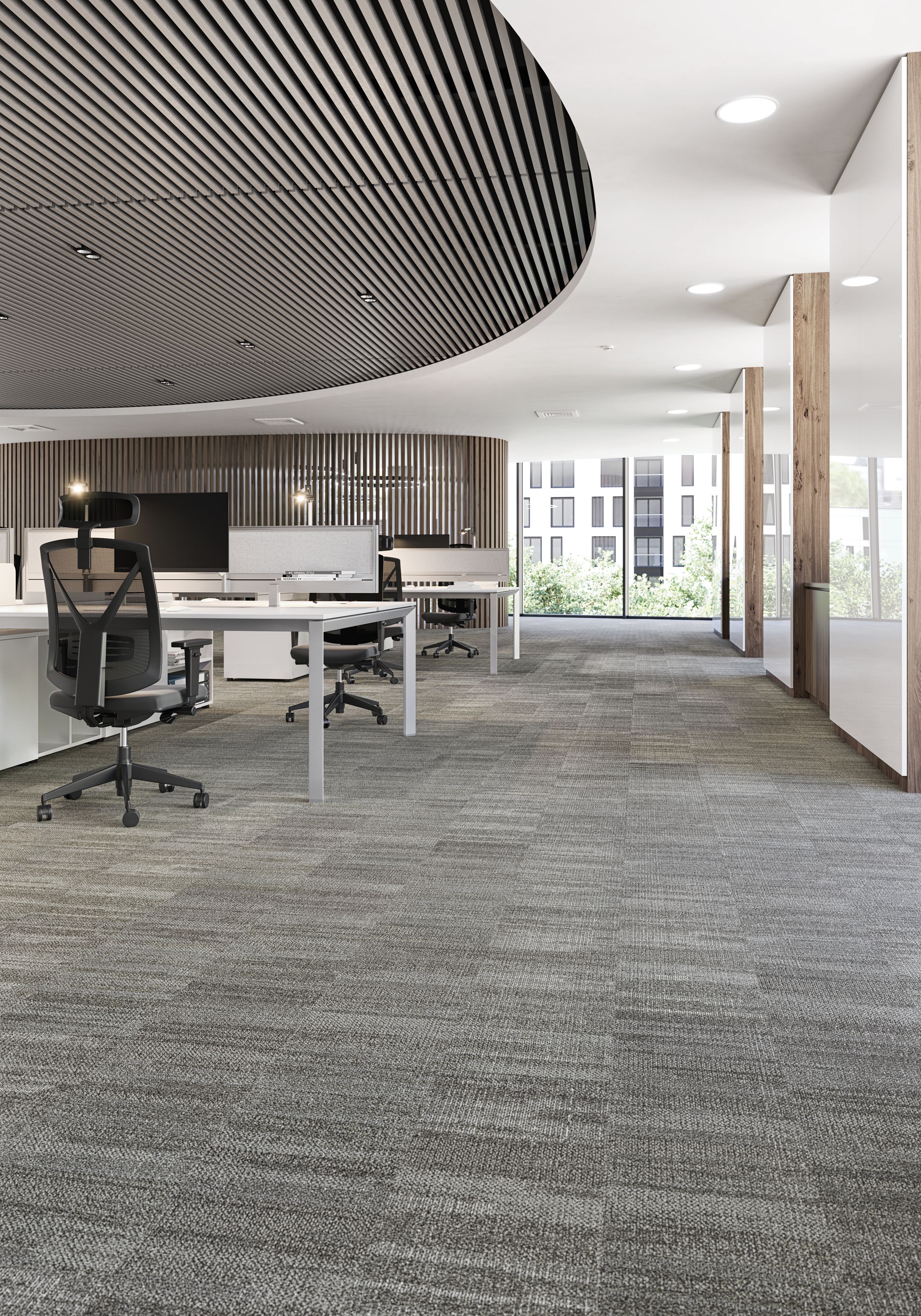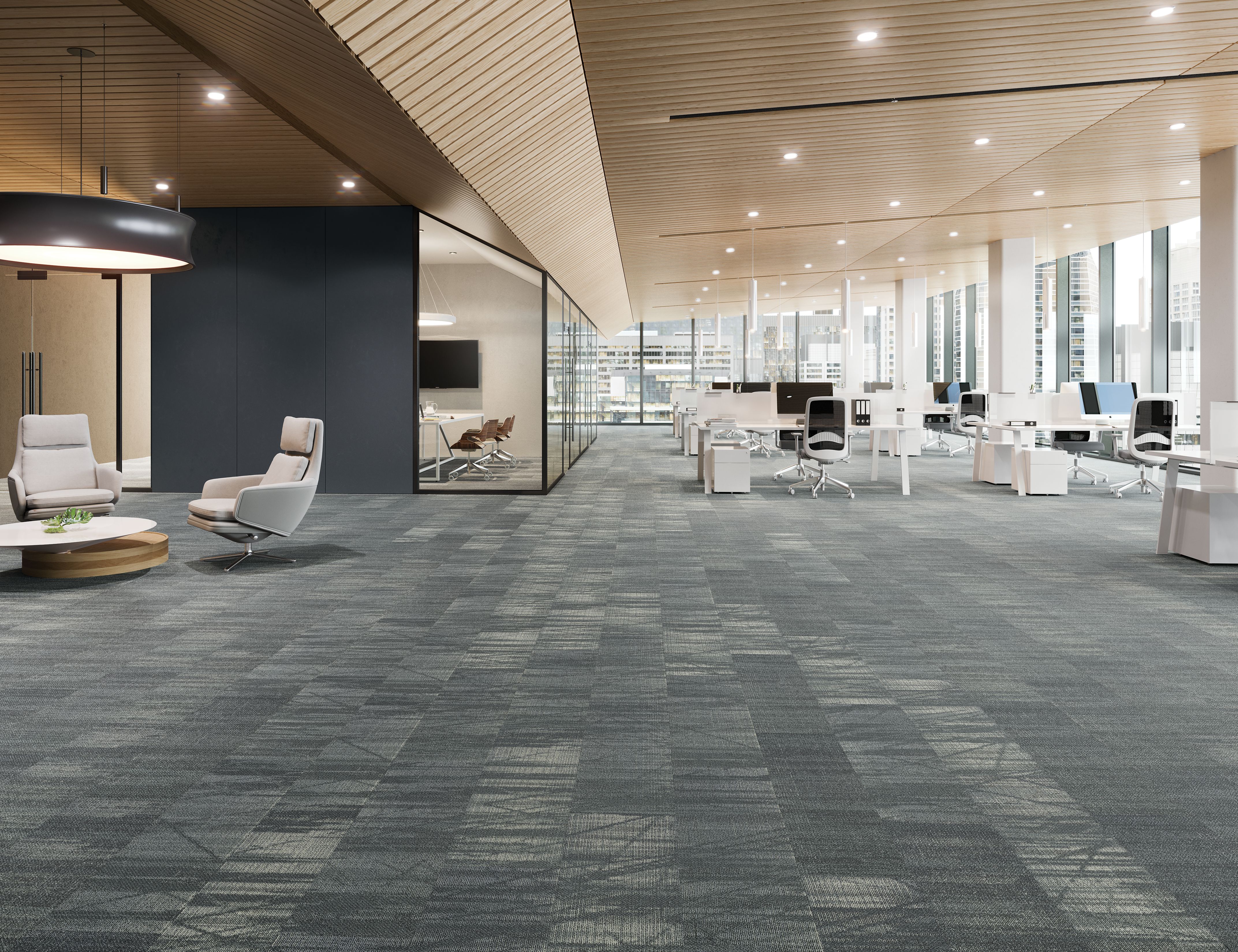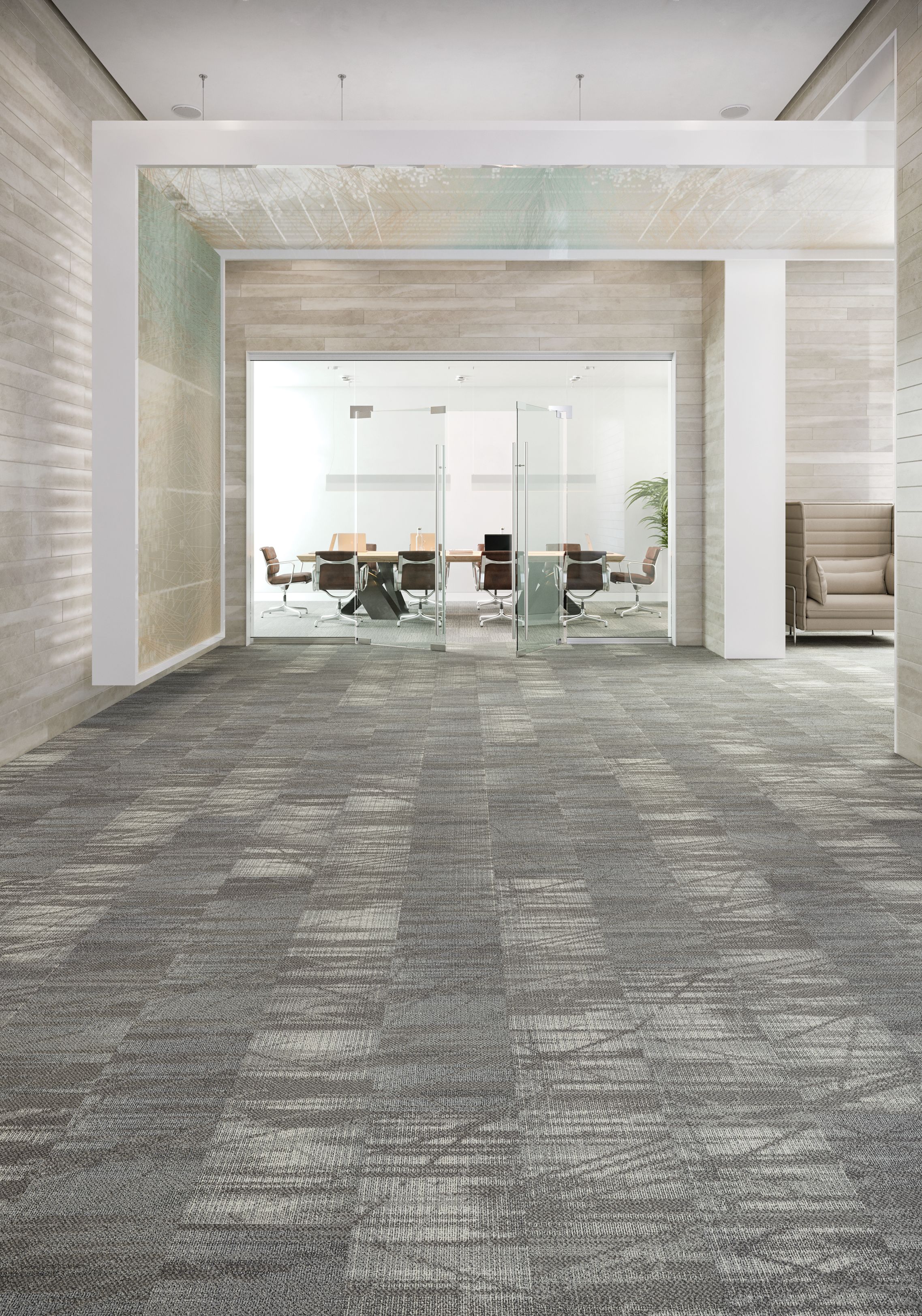 A selection of 8 colorways references the confluence of estuaries, with gradations of colorways from light to dark that mimic transitioning waters. Three carpet tile styles feature a combination of solid, heathered and twisted yarns for dimensional textures that celebrate the movement of water.